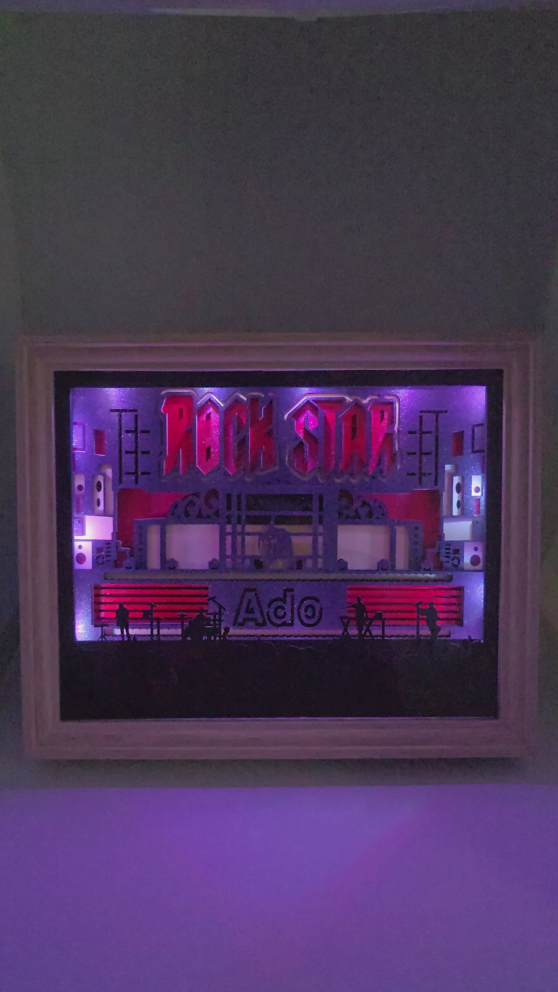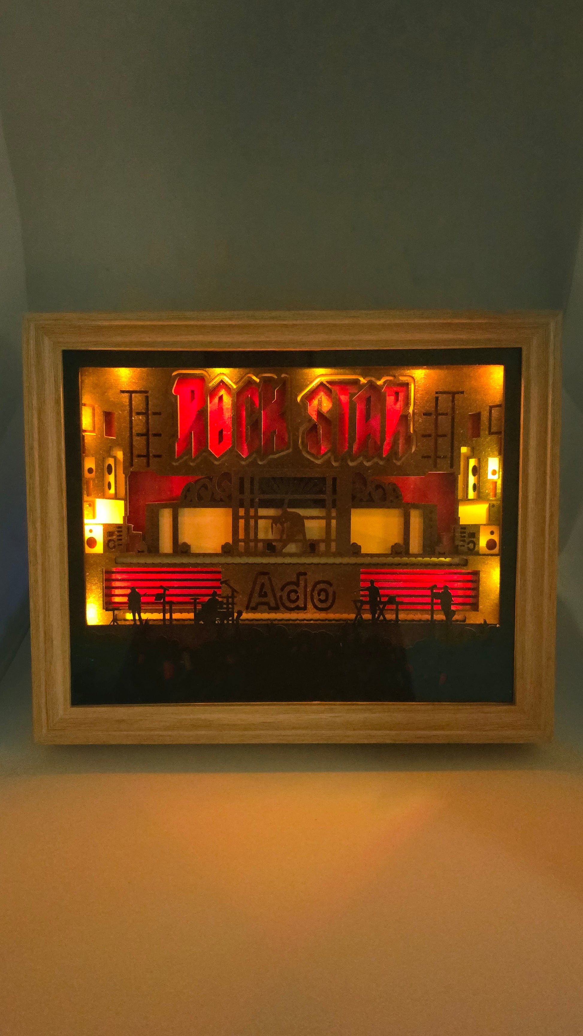Pièce artisanale en bois multicouche, peinte et découpée au laser, montée dans un cadre bois avec vitre en façade pour une finition élégante et une protection durable. L’éclairage LED RGB se pilote à la télécommande ou via appli smartphone pour créer l’ambiance parfaite autour de « ROCKSTAR ».